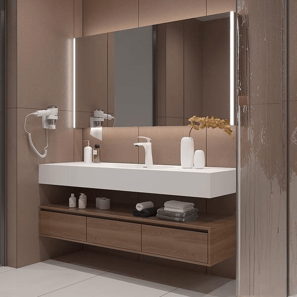 无极调光功能:这款浴室柜的无极调光功能让你能够准确的通过不同的使用场景随意调节光线强度。无论是化妆还是放松洗浴,都能找到最适合的光线,营造出理想的氛围。